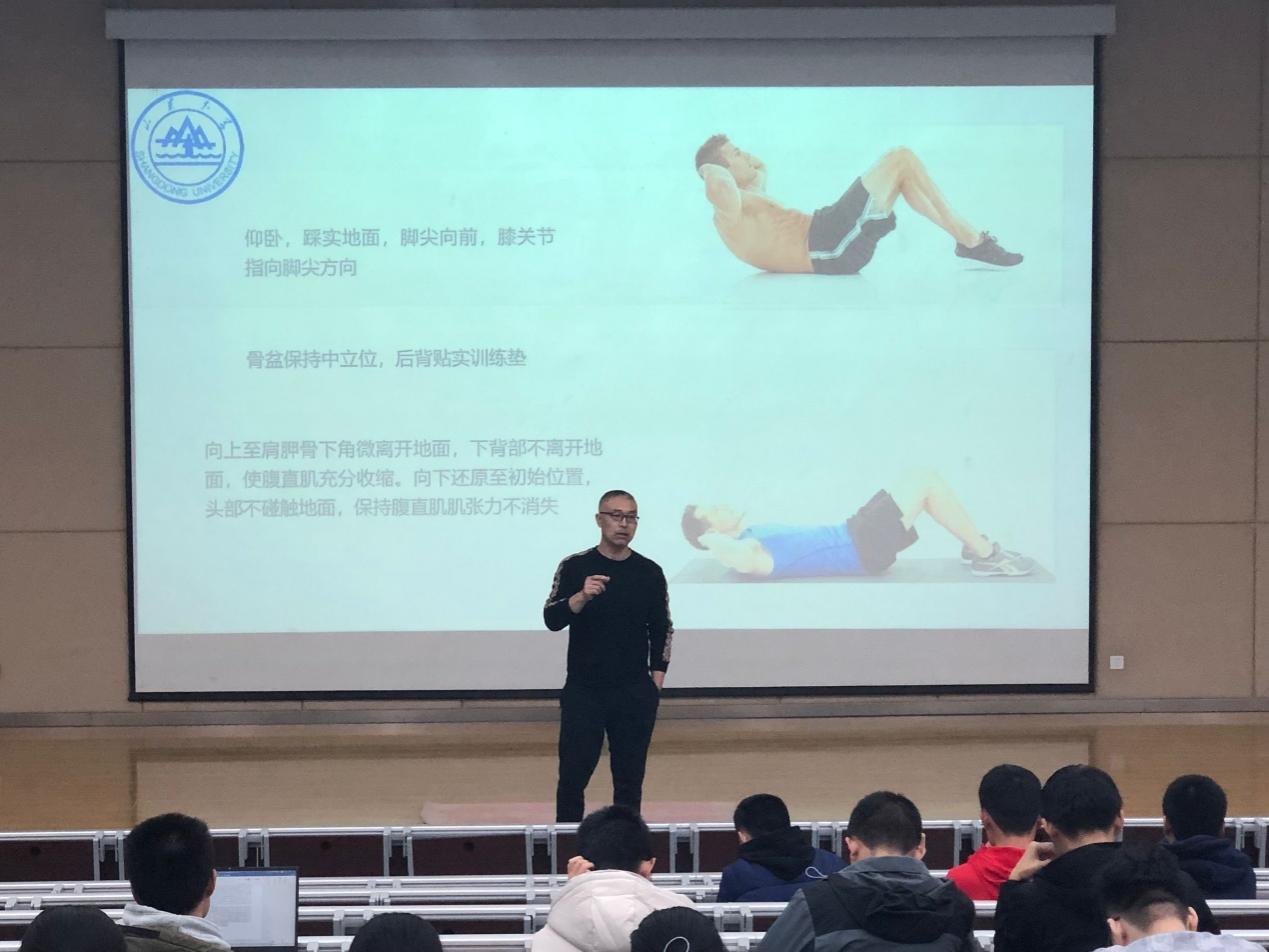 讲座伊始,张军以体测为切入点,提出每一项体测项目实际检测的身体素质,通过提问的方式引导学生思考身体不同区域肌肉的作用,并向学生介绍了肌肉的训练方法——抗阻训练。他结合图片与视频为学生生动讲解了各项抗阻训练的动作要领及其所锻炼的肌肉区域,并邀请同学上台尝试。参与人员间积极互动,现场的气氛轻松活跃。张军亲身示范讲解了体测项目引体向上的动作要领及训练方式,为不同情况的同学制定了不同的训练方案,指出锻炼的关键在于持之以恒,鼓励学生每日坚持锻炼。学生们自由提问,张老师为学生们答疑解惑。提问环节结束后,他再次提醒同学们注意动作的规范,循序渐进,不可急功近利,表达了对学生们坚持锻炼、强健体魄的期望。