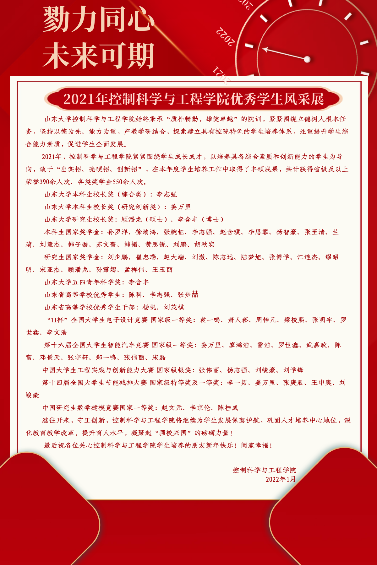近年来,学院坚持以德为先、能力为重,产教学研结合,提升育人水平,致力于培养传承山大基因、服务国家战略、守正开拓创新的模范榜样。为优秀学生家庭寄送喜报是依托学校、家庭和社会各方共同营造积极向上氛围的有效抓手,是坚持家校共育的有力举措,也是宣传“控院风采”的重要途径。通过喜报寄送形式来充分展示学院学生工作的服务理念,增强学院管理和服务学生的软实力和品牌效应,从而更好地凝聚起协同育人合力,紧抓发展机遇,构建创新格局,为培养勇担中华民族伟大复兴使命的时代新人贡献力量。