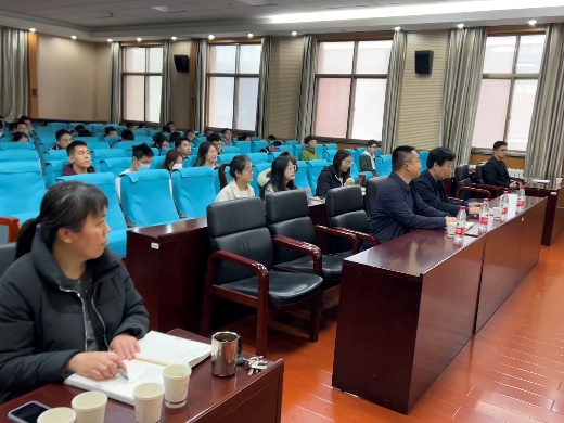学生就业创业指导中心主任肖祥主讲,学院党委副书记李文振、辅导员梁瑞涛参加,与同学们一同探讨就业求职问题。