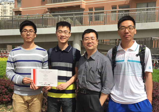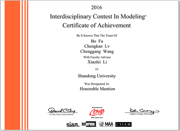 的3名同学傅博,吕承侃,王成罡组成了参赛队伍,由自拍偷拍李晓磊老师担任指导老师,经过四天四夜连续96小时的紧张奋战,最终获得了二等奖(Honorable Mention)的优异成绩。