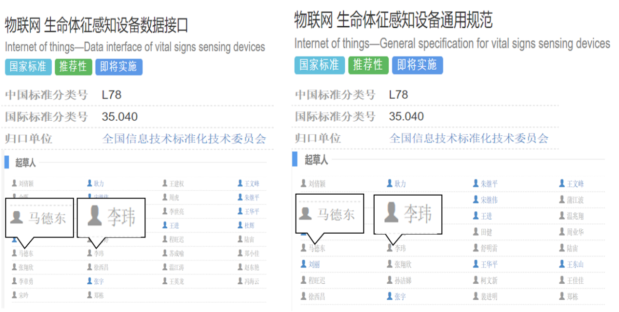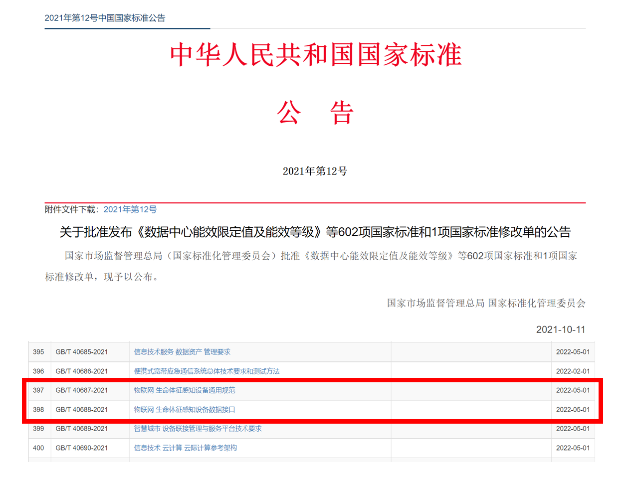 《物联网生命体征感知设备通用规范》和《物联网生命体征感知设备数据接口》两项国家标准的制定,统一了应用物联网技术的生命体征感知设备的技术要求和试验方法,统一了生命体征感知设备到生命体征检测系统的数据接口的总则、通用接口要求以及通用接口和业务接口的基本功能和参数的要求。这两项国家标准的发布将规范统一生命体征感知设备的设计、研发、生产和使用,助推医疗行业的规范化、标准化发展。