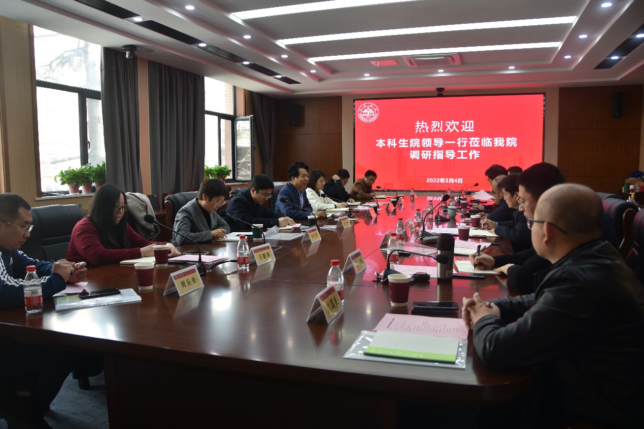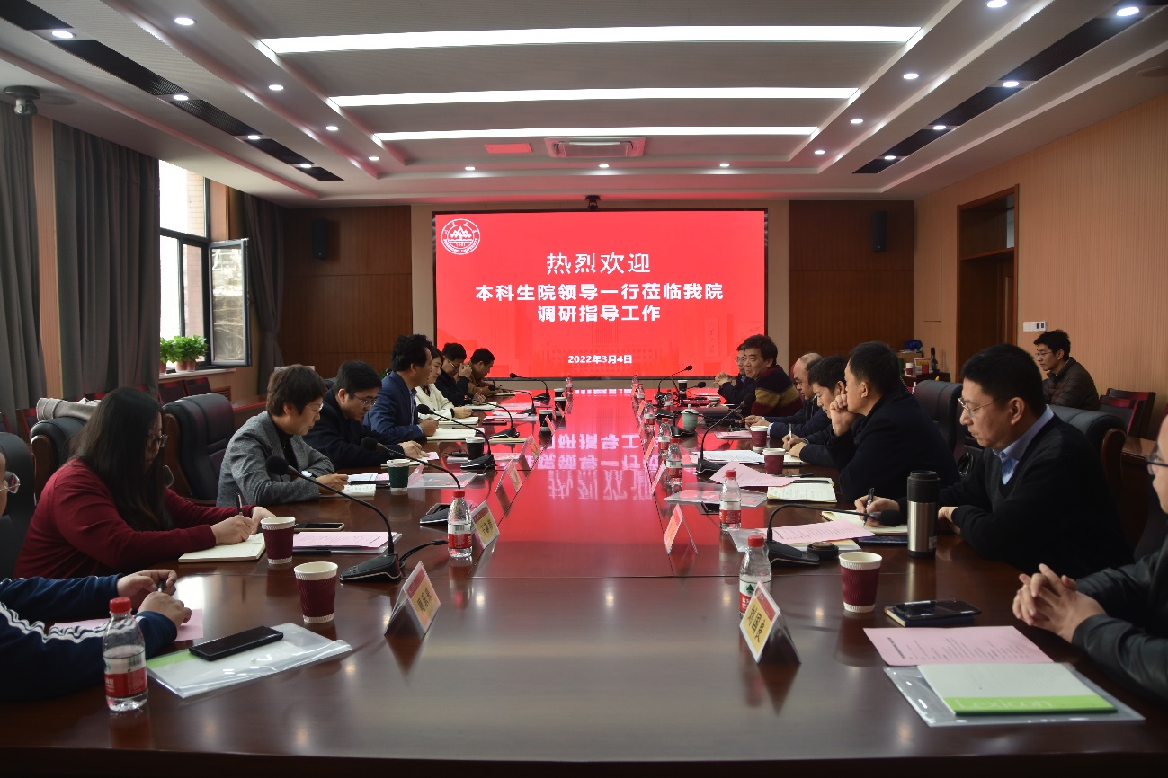 调研指导表示了热烈欢迎,并向与会人员介绍了学院整体发展概况及人才培养所取得的成绩,分享了学院在凝共识聚人心、健全治理体系、施行治理策略以及优化调整专业等方面的宝贵经验。他指出,为了培养一流本科人才应把专业建在优势学科之上,教研相长,互促共进,革故纳新,立德树人,为学生发展提供多元个性化成长空间,鼓励开展学科交叉,深化医工融合。他围绕学校本科教育教学工作要求,对学院的一流专业、一流课程、一流教材、教学成果奖等重点工作做了分析和展望。他表示,本科教育是大学的根本,学院将积极配合学校做好相关工作,希望学校针对学院建设与发展中所遇到的困难与问题,综合统筹安排并给予积极支持。