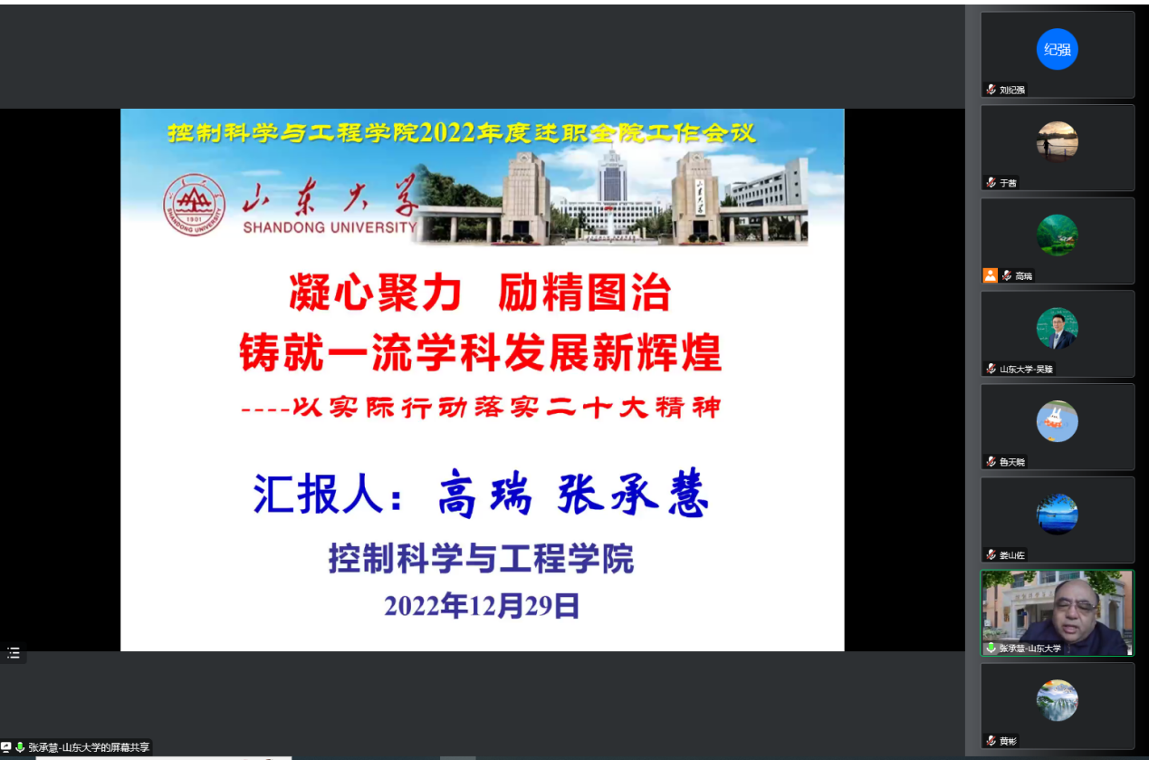“优秀基层教学组织”。杰出人才引育彰显新高度,新增国家杰青1人(高峰)、国家四青人才7人,其中国家优青2人、海外优青4人(均占全校的1/6)、青年拔尖1人,再创学院国家级人才增量历史新高;新增IEEE Fellow、ESI全球“高被引科学家”各1人、泰山学者青年专家6人。国家级人才增量/总量位居全校第一、全国同类学院学科前列。国际合作实现新跨越,获批2023年高校创新引智基地,为全校唯一。立德树人取得新成果,打造国家级一流专业全覆盖新格局,获山东省教学成果一等奖3项,获推申报国家级教学成果奖2项,山大教学终身成就奖1项。学科建设跃上新台阶,控制科学与工程学科晋级A类,综合实力名列全国同学科前茅。科学研究再创佳绩,获中国工程院光华工程科技奖和教育部技术发明一等奖各1项;山东省科学技术奖二等奖3项;中国自动化学会自然科学奖一等奖1项、二等奖3项。立项科研经费达1.5亿元/到位经费1.06亿元,暂居各学院之首。他强调,下一步学院将持续深入学习宣传贯彻党的二十大精神,加强组织建设,践行立德树人,强化学科建设,优化科研布局,深化国际合作,持之以恒用好“3D”工作法,为学校“双一流”建设贡献更大的控院力量和控院经验。